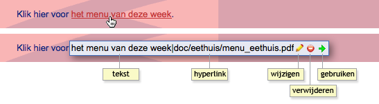 A hyperlink is a clickable piece of text or a photo that refers to another page of the website, a document, another website or an e-mail address. With WebEtui-CMS it is easy to make and use hyperlinks with the hyperlink-info popup and the hyperlink dialog.